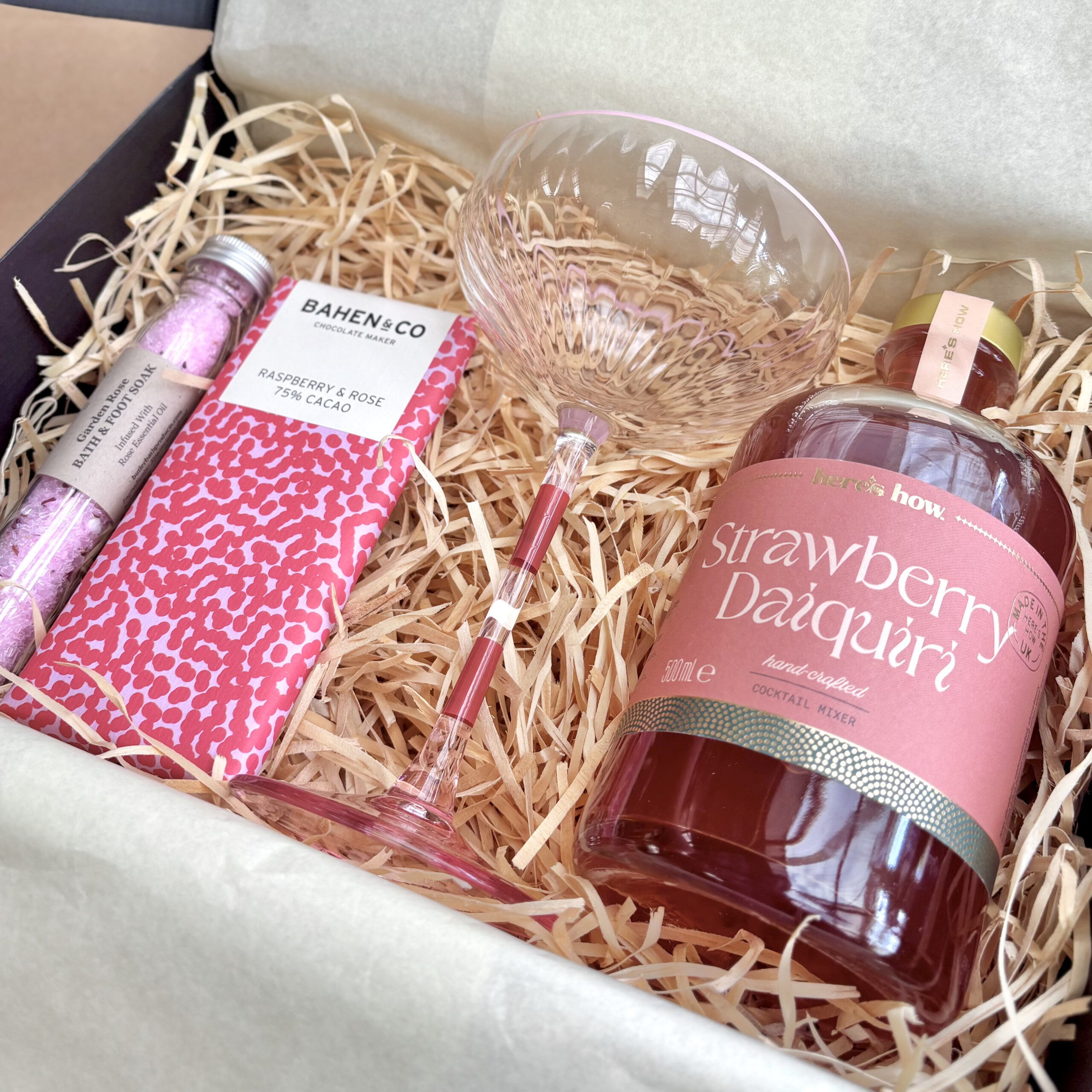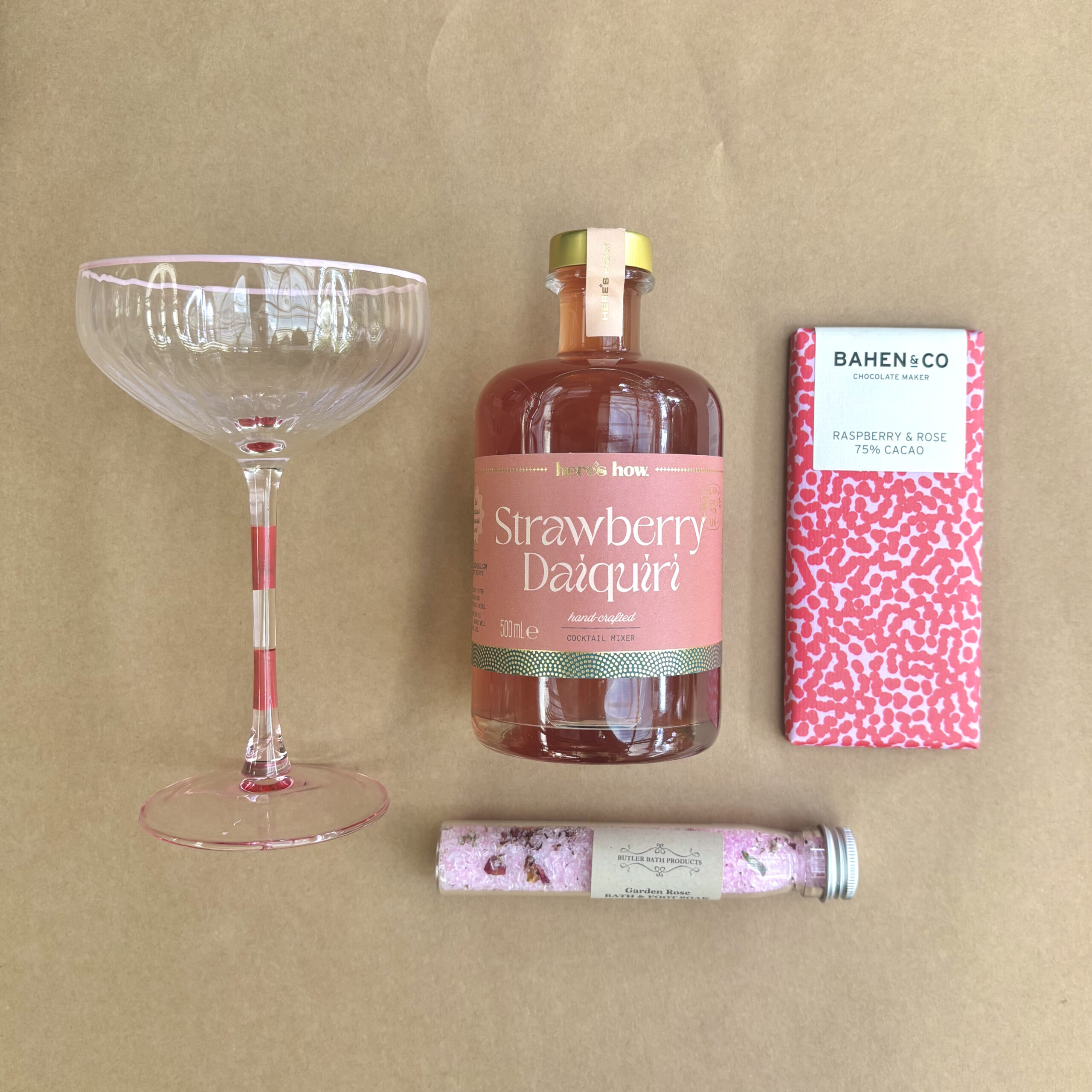 Here’s How hand crafted Strawberry Daiquiri mixer is a classically uncomplicated blend of juicy strawberry and bright, zesty citrus and just a hint of natural sweetener for the perfect cocktail. Designed to be paired with a favourite rum, vodka or alcohol free alternative; making for a refreshing and fruit forward drink whether they fancy a cheeky tipple or sober treat. A gorgeously playful cocktail glass adding extra joy with every sip.