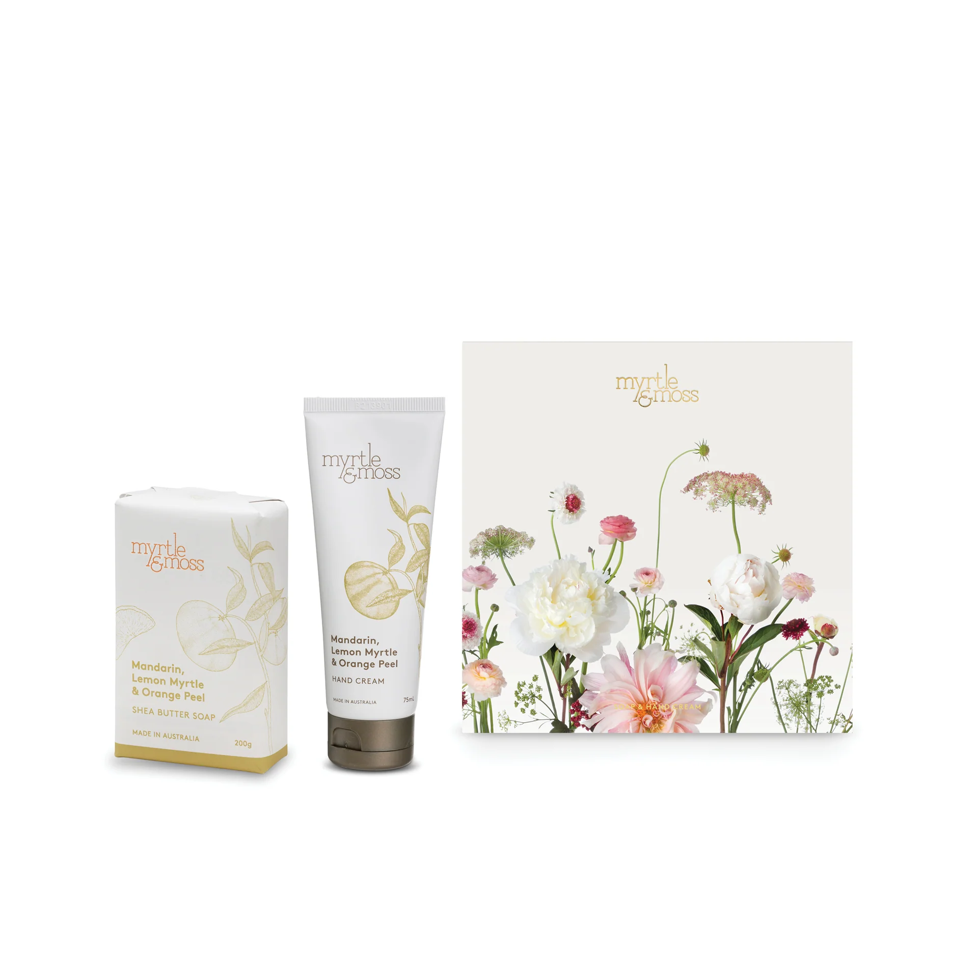 The perfect pair. A gentle botanical soap and nourishing hand cream by Myrtle & Moss in their most popular scent – Mandarin, Lemon Myrtle & Orange Peel.