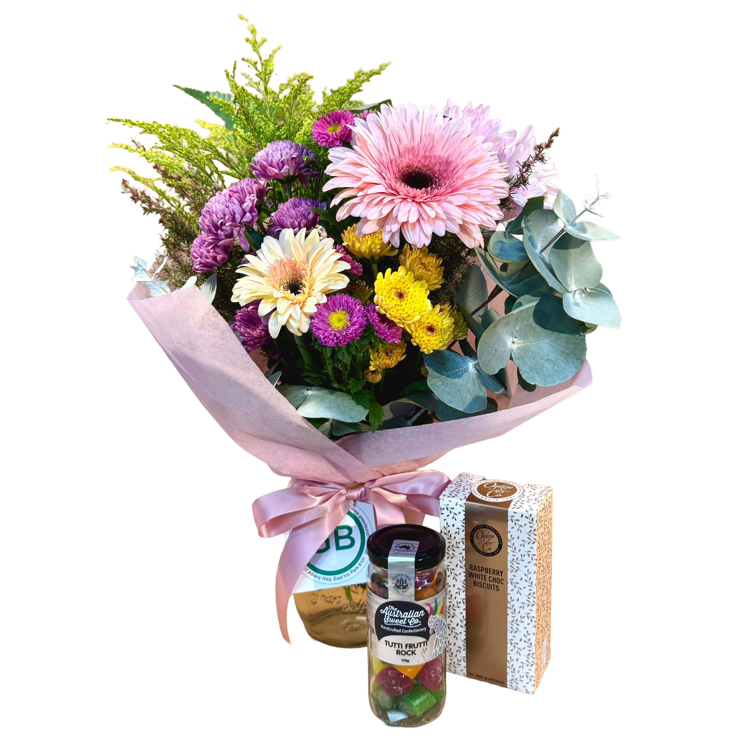 Beautiful fresh, seasonal flowers in our signature jar, paired with sweet, buttery cookies and handcrafted rock candy. Perfect for your favourite sweet tooth!