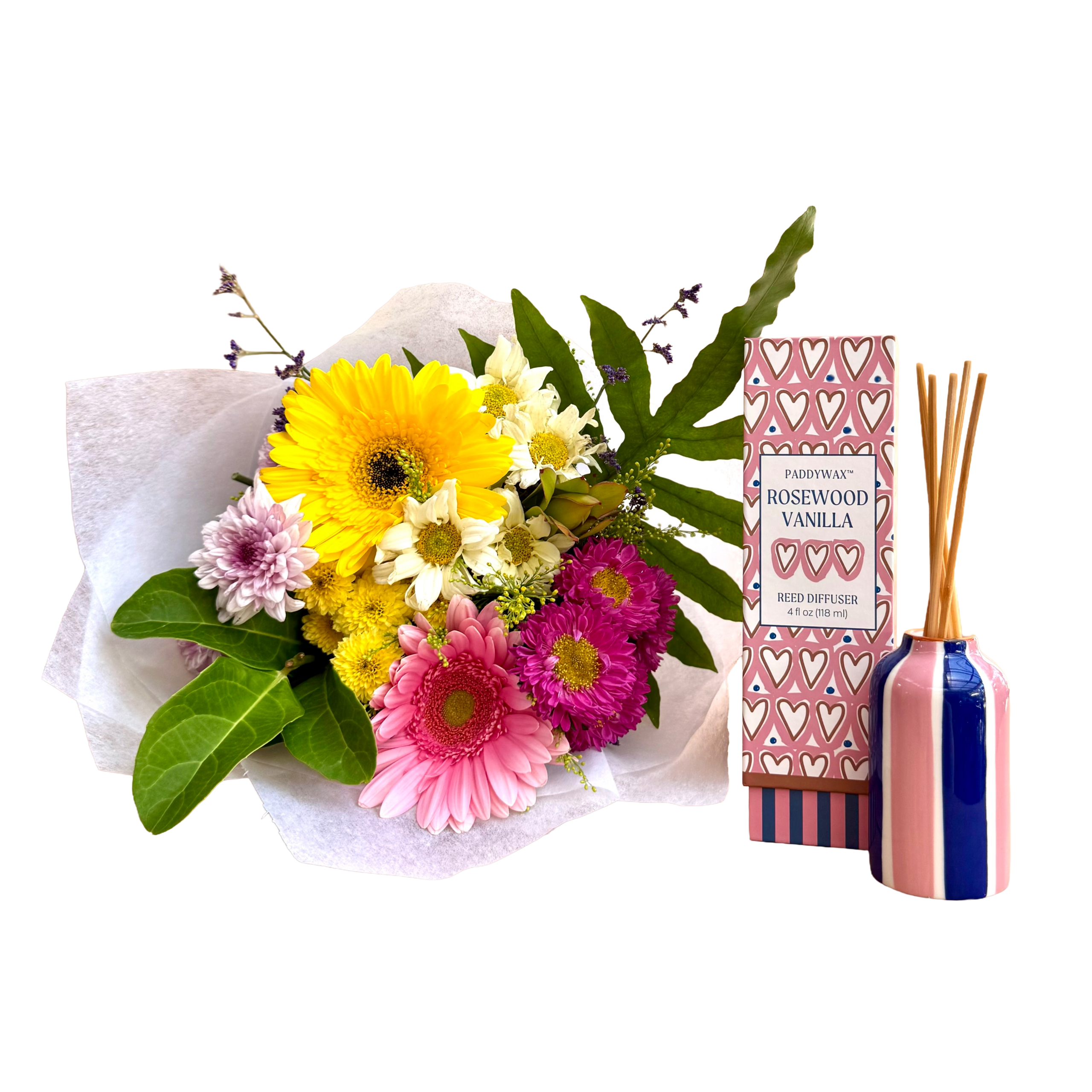 A seasonal posy of fresh flowers, paired with gorgeously scented Paddy Wax Rosewood & Vanilla reed diffuser.