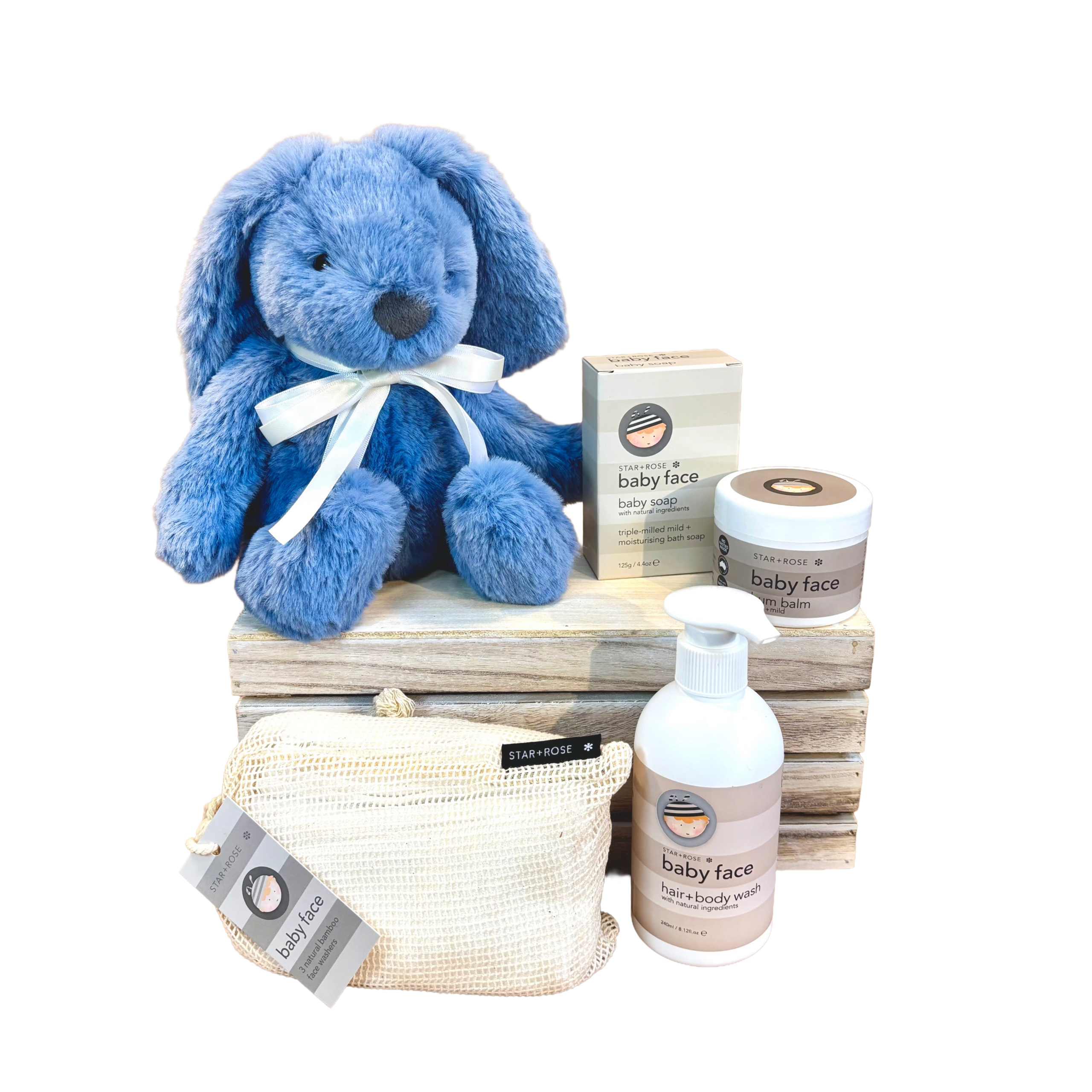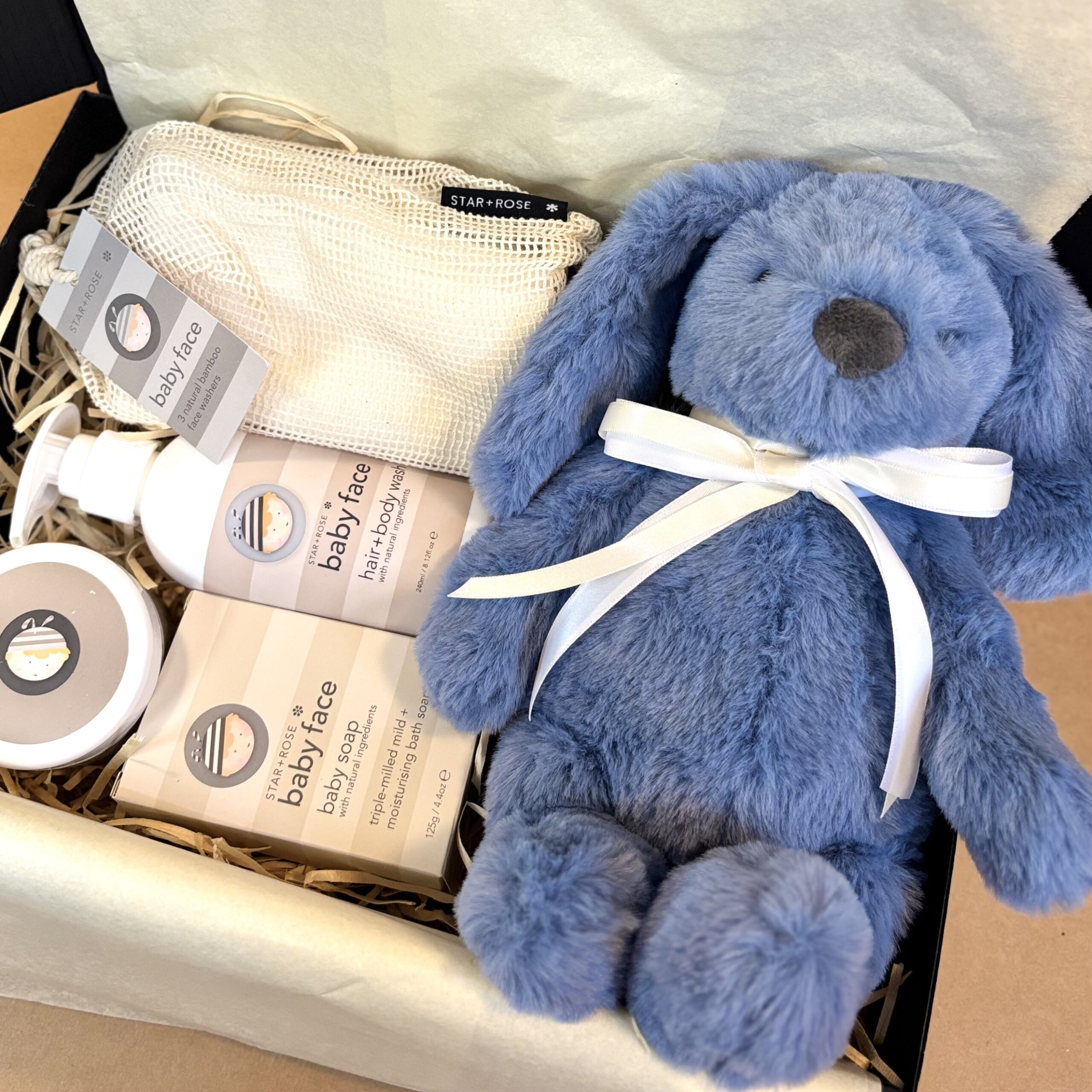 Celebrate the arrival of a new little one with a thoughtfully curated box, filled with all natural baby care essentials, and delightfully plush bunny.