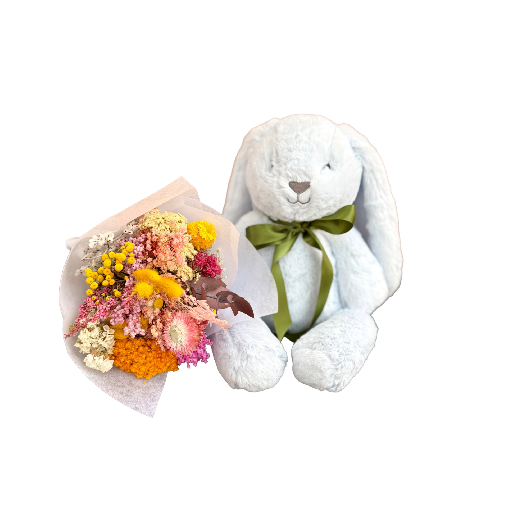 A charming mix of preserved flowers, bursting with colour and natural whimsy, paired with an irresistibly soft stuffed toy bunny. This delightful duo brings joy and warmth—perfect for celebrating new arrivals, birthdays, or just because. A sweet, heartfelt gift to brighten anyone’s day.