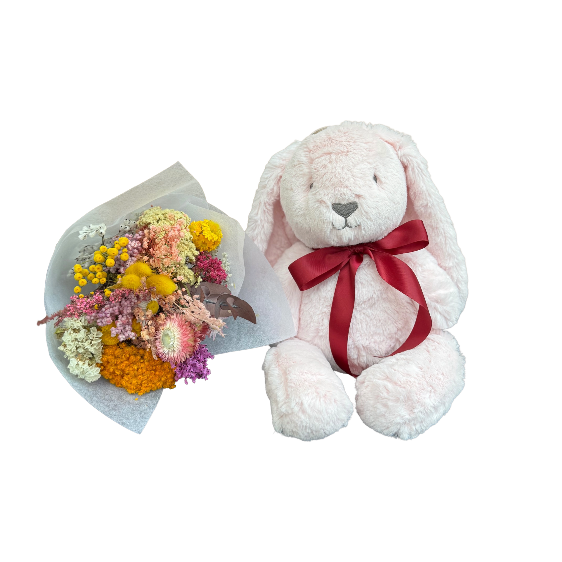 A charming mix of preserved flowers, bursting with colour and natural whimsy, paired with an irresistibly soft stuffed toy bunny. This delightful duo brings joy and warmth—perfect for celebrating new arrivals, birthdays, or just because. A sweet, heartfelt gift to brighten anyone’s day.