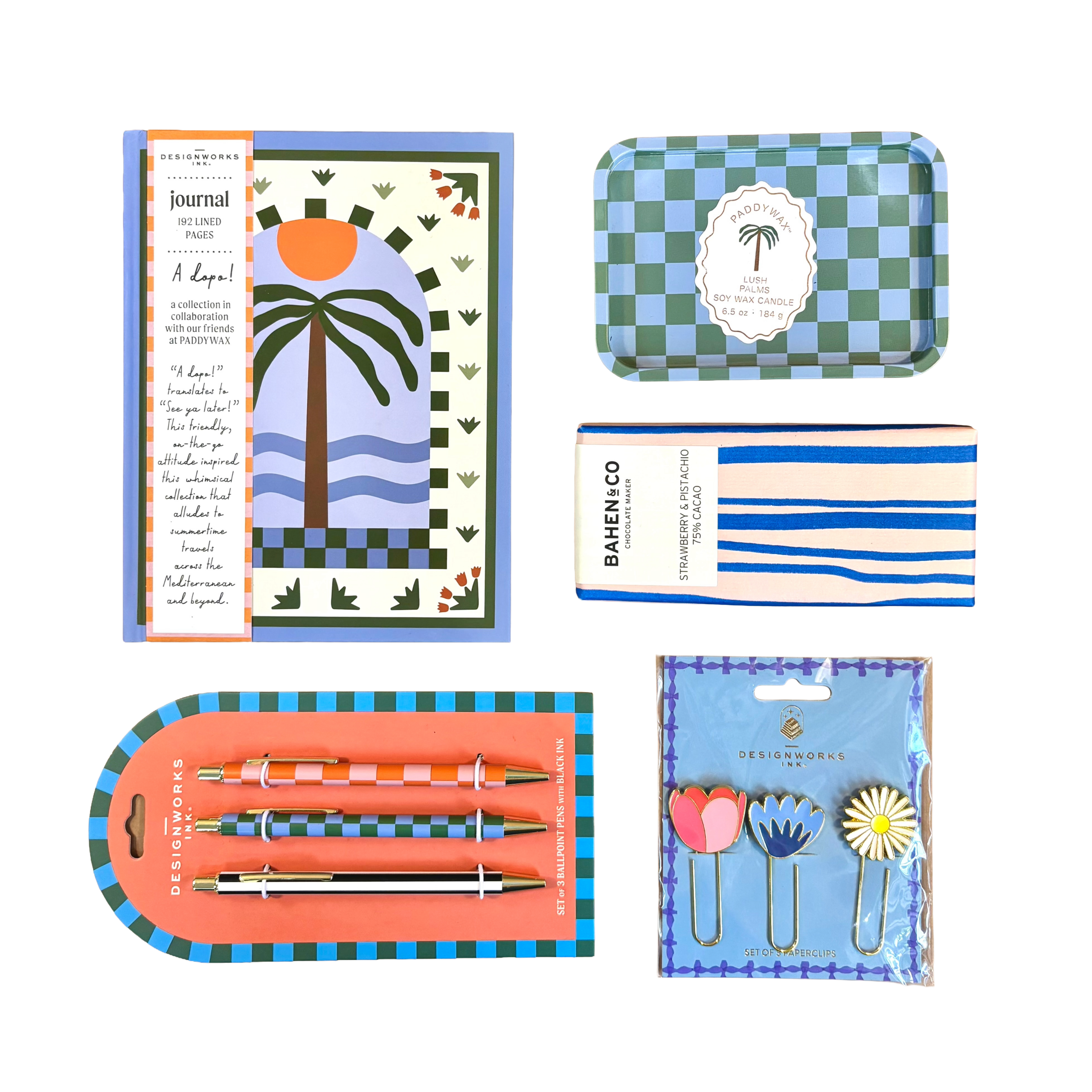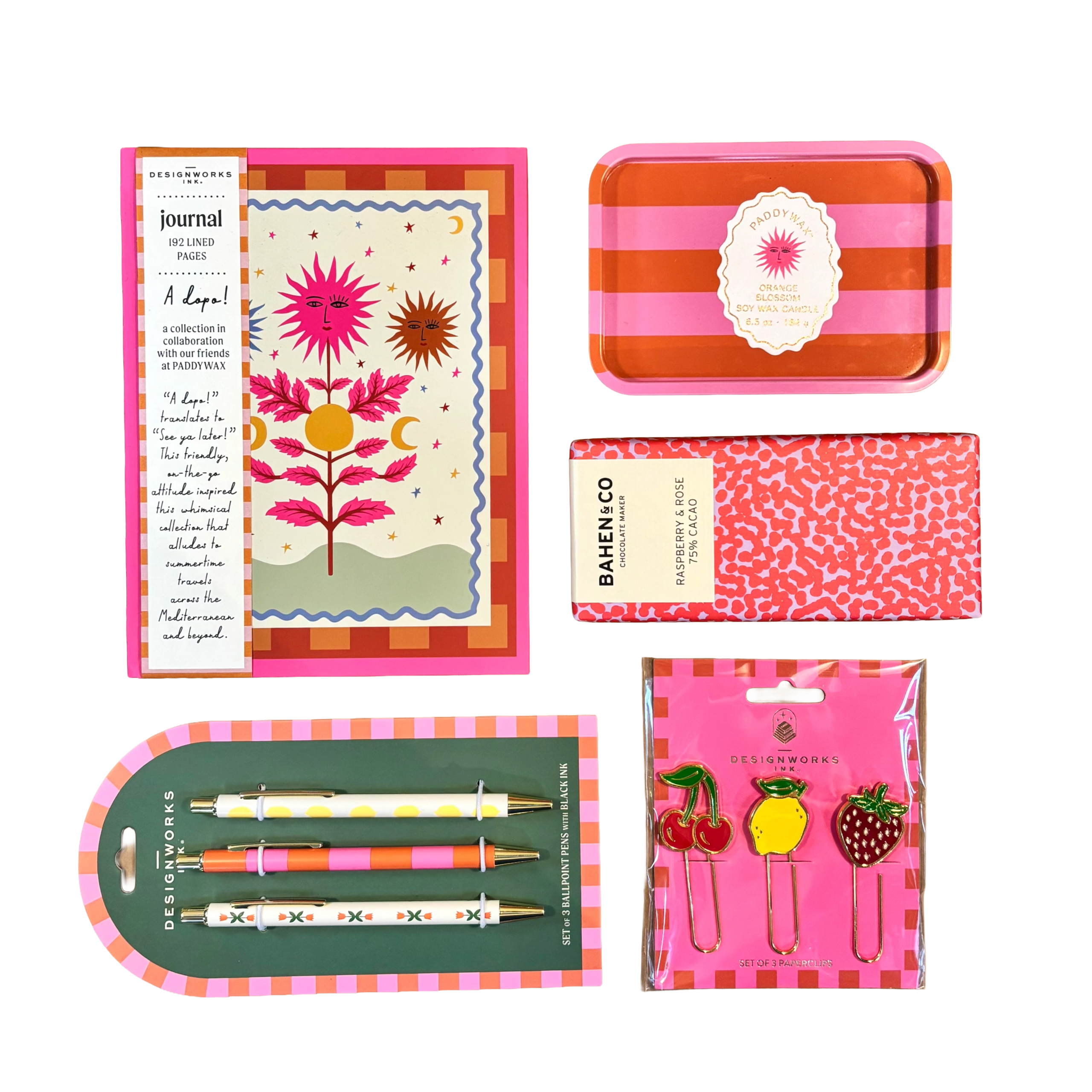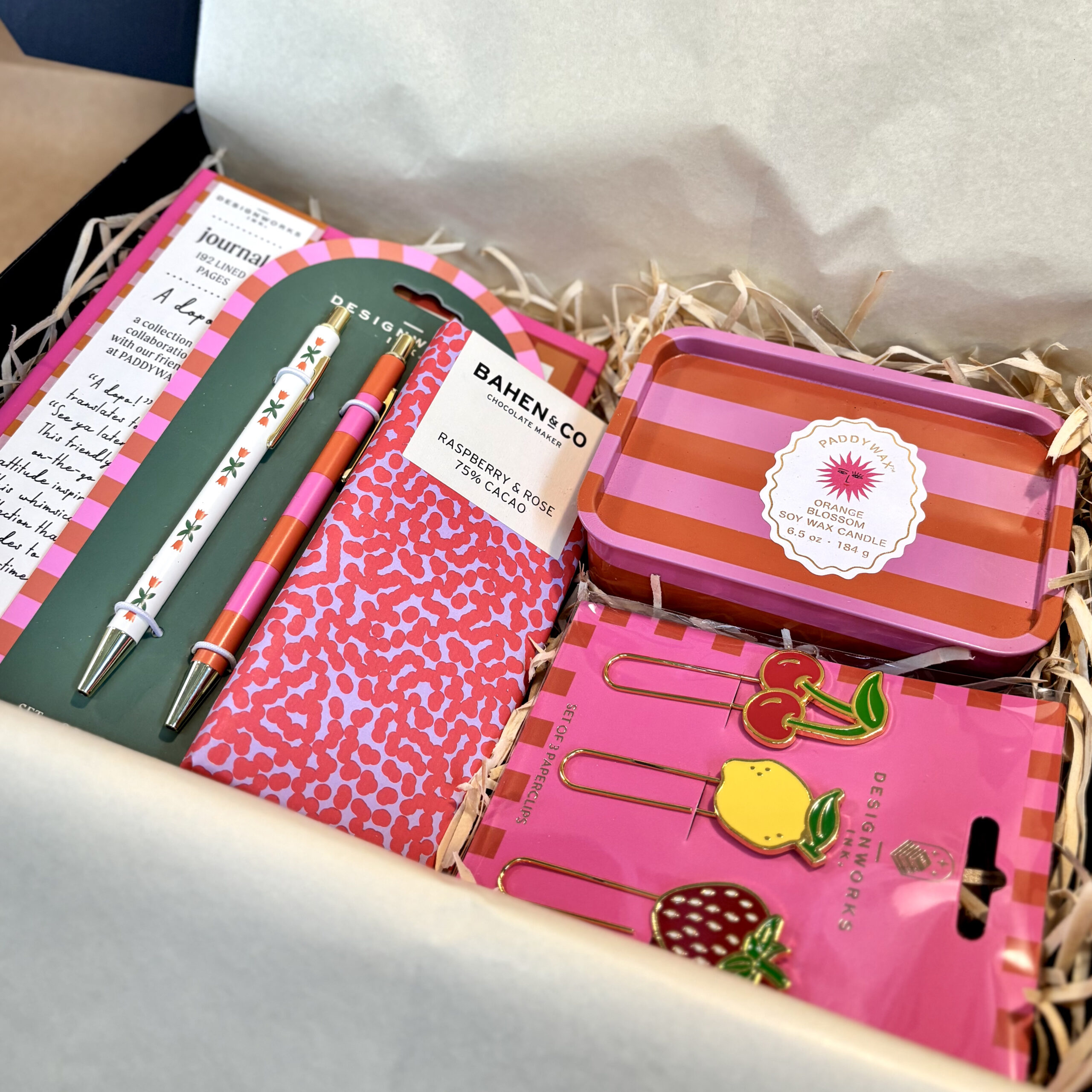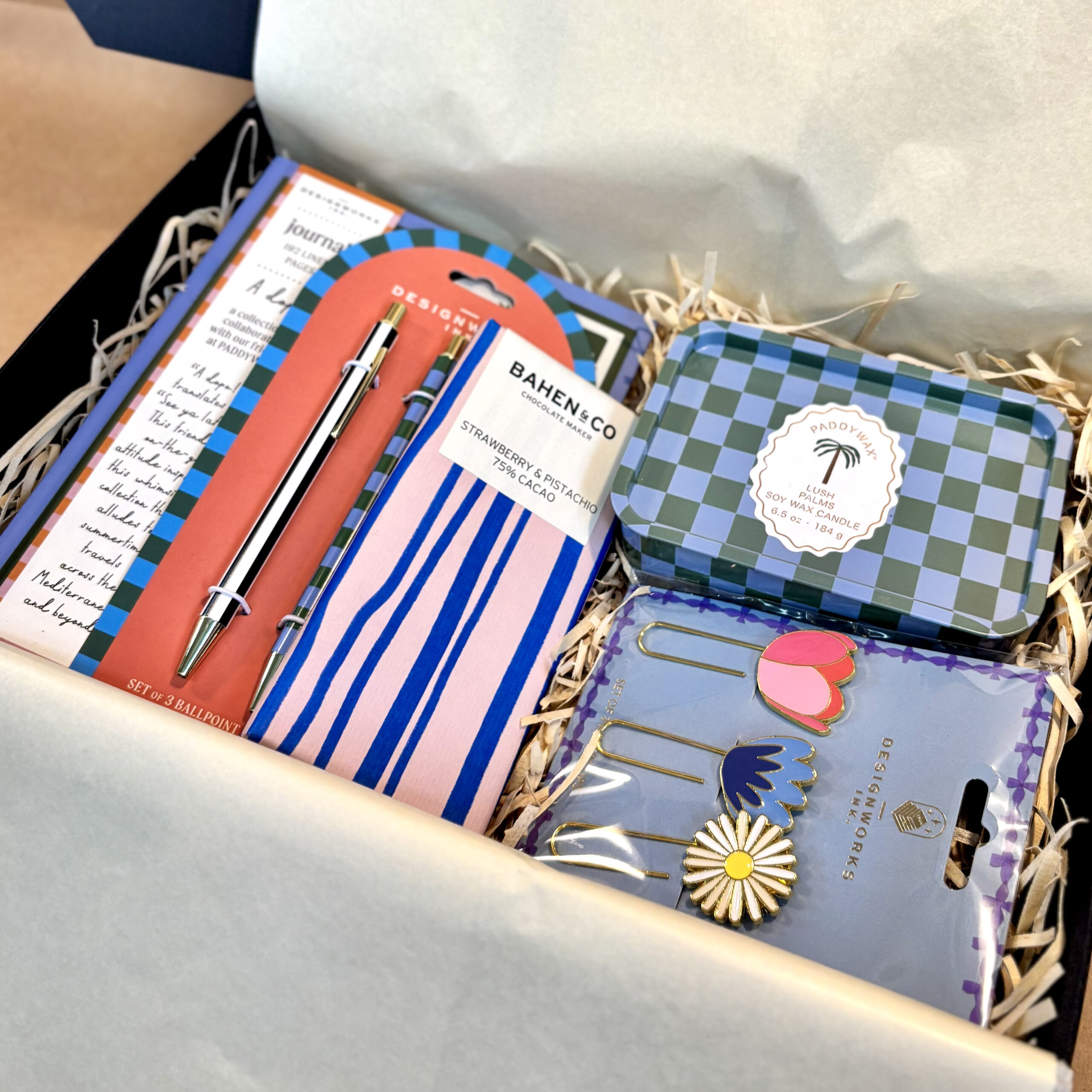 A Paddy Wax soy candle scents the space and creates a calming environment perfect for productivity. A gorgeous hardcover notebook, pen trio and playful paperclip set keep daily tasks organised (and looking good!) while a sweet bite of Bahen & Co dark chocolate keeps life sweet and energy levels up.