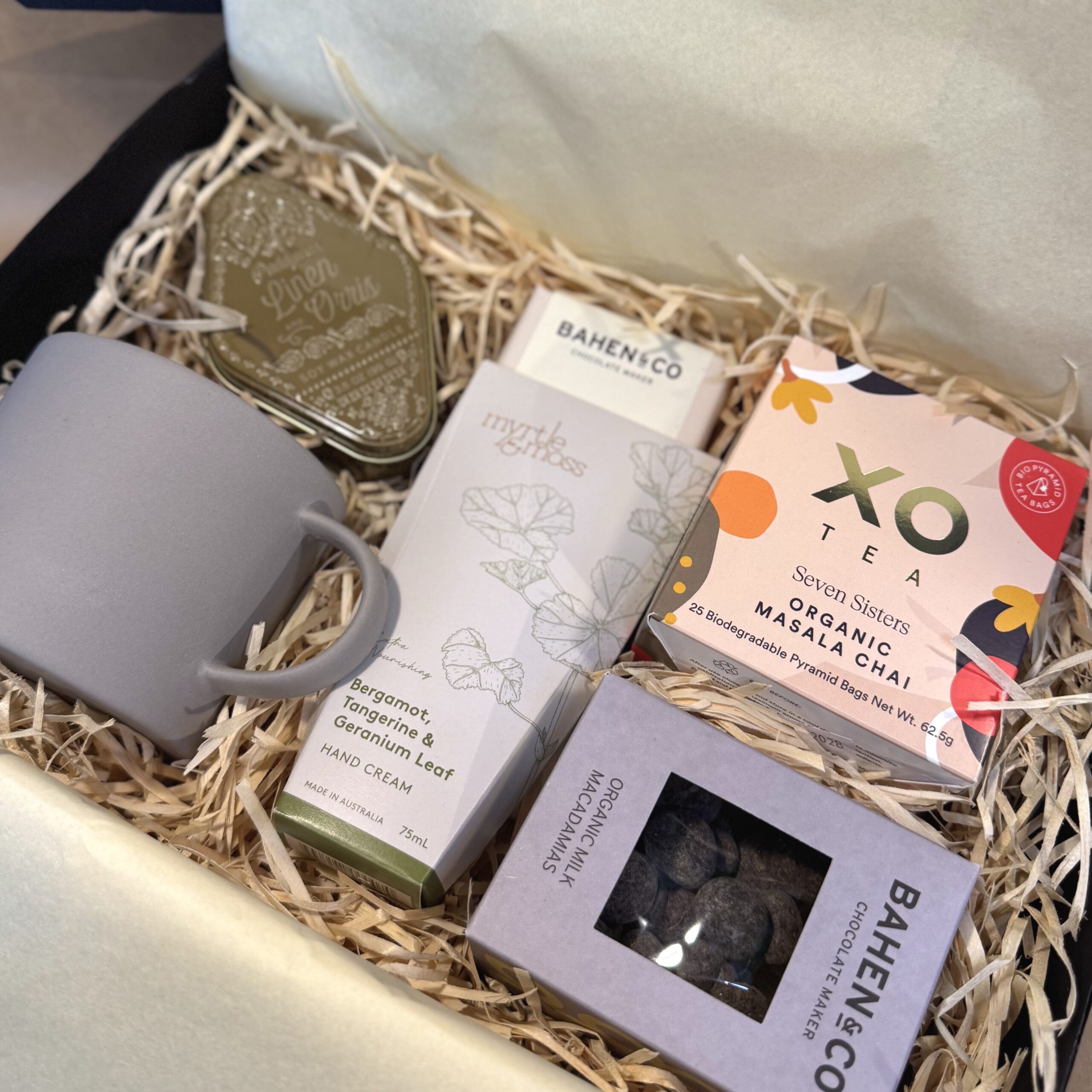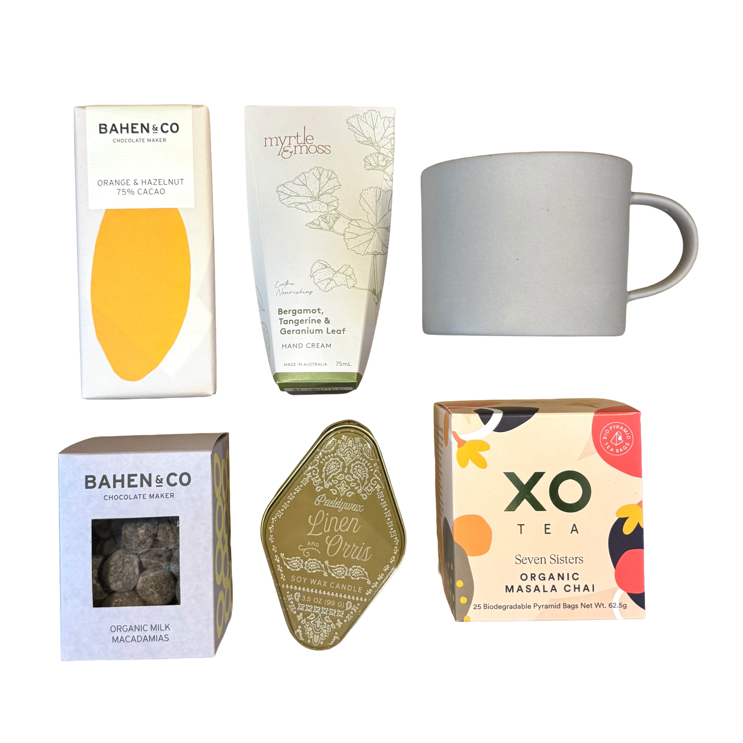 A Paddy Wax Linen & Orris candle sets the tone with a soft, calming scent. Chai spiced with clove, cinnamon, ginger, nutmeg and cardamom soothes and revitalises, served in a mug that feels just right. Hands are nourished with a gentle Myrtle & Moss hand cream.