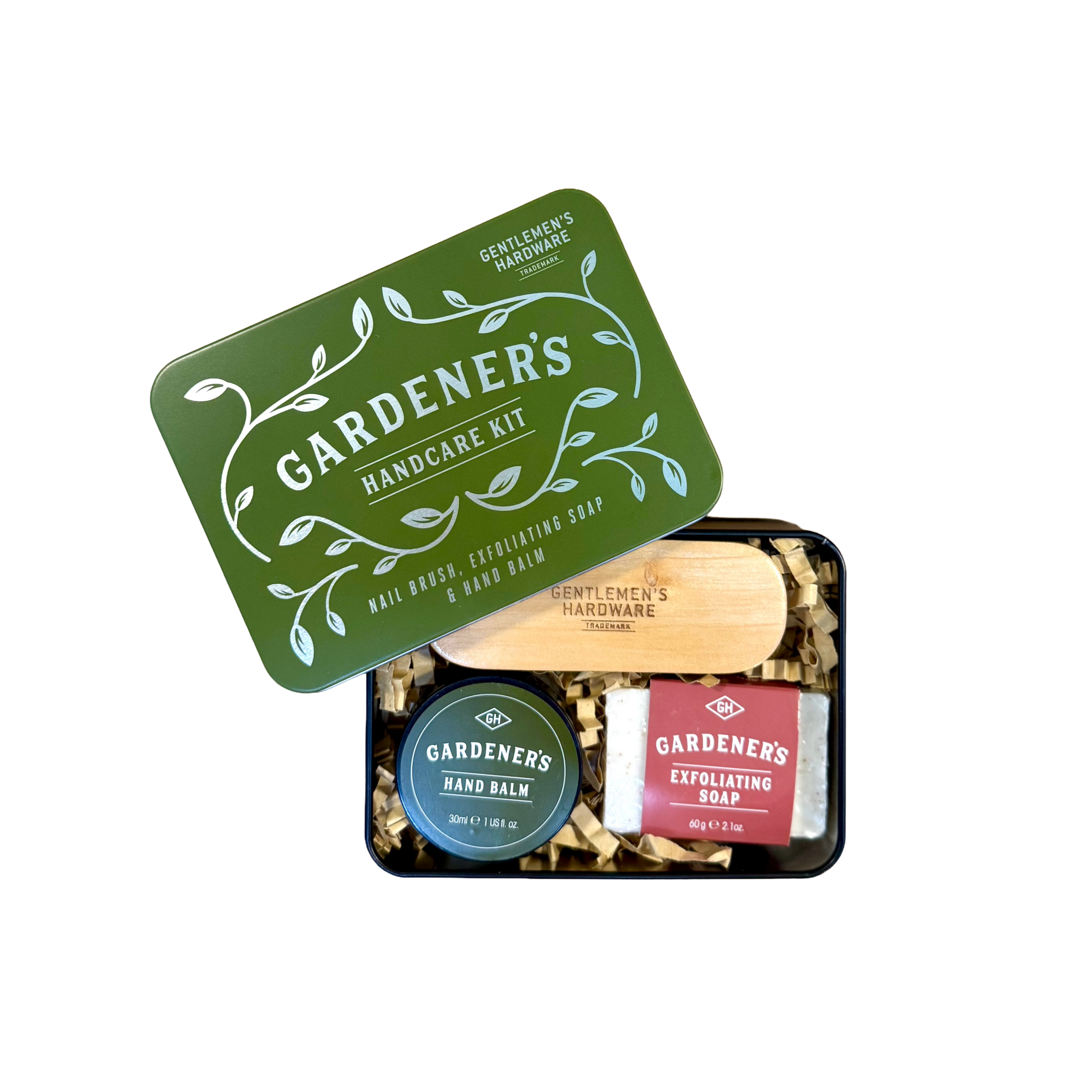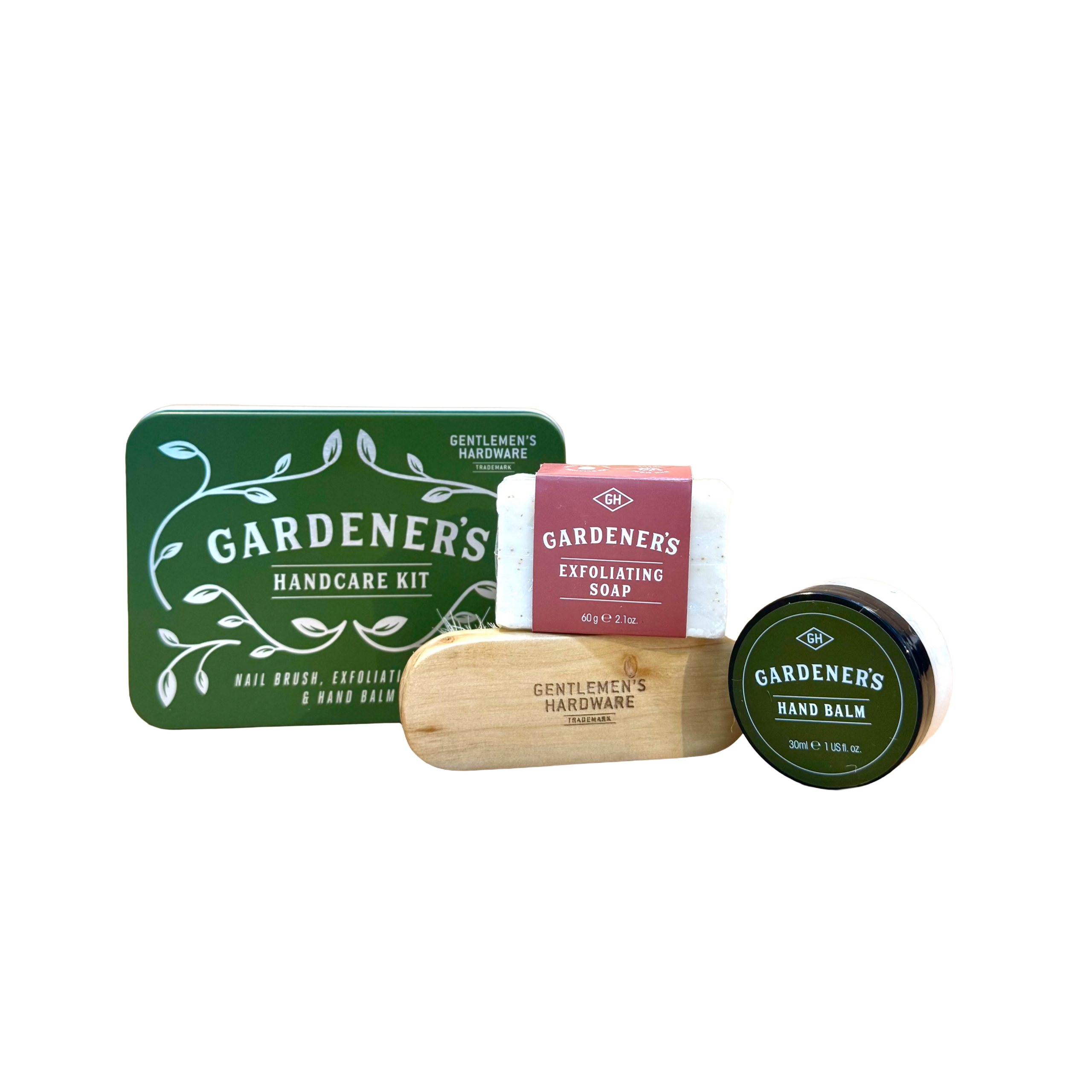 Featuring a nail brush, hand soap, and moisturising hand balm. Made for keeping hard working hands cleansed and nourished. Presented neatly in a compact tin, making it ideal for easy gifting and storage.